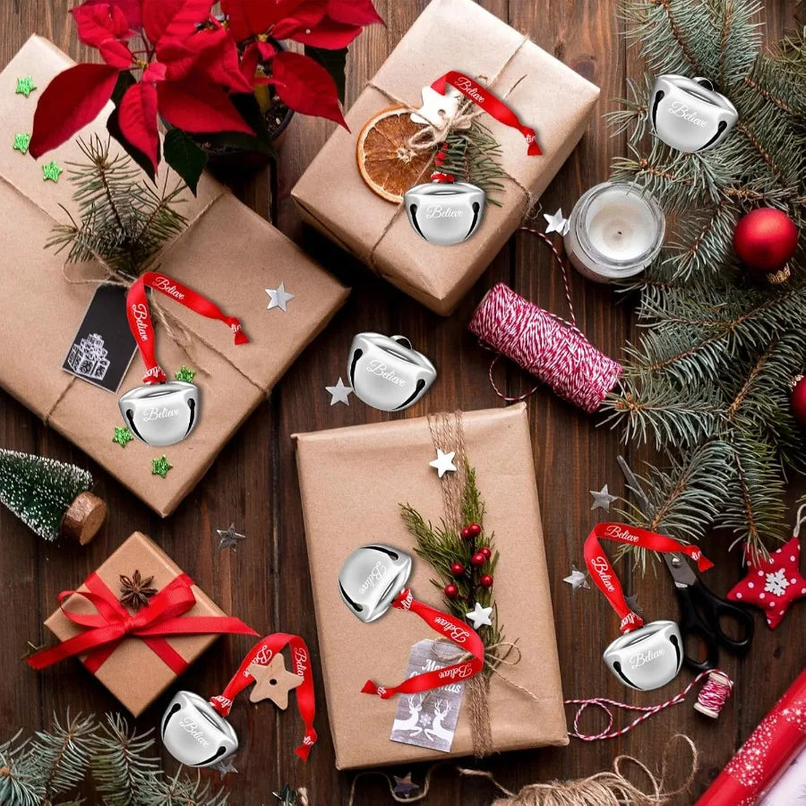24 Pcs Christmas Believe Bell Ornaments 1.5 Inch Polar Santa Sleigh Jingle Bells with Believe Ribbon Christmas Tree Decorations